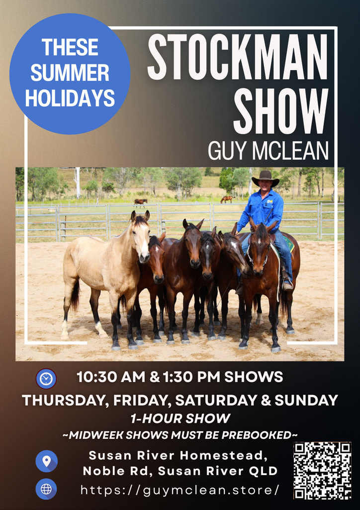 You're warmly invited to visit the McLean Family’s Susan River Homestead Resort, where Guy looks forward to sharing some of the techniques that earned him two World Championships and an Australian Championship in young horse starting. He continues to entertain audiences worldwide with his outstanding equine performances. Enjoy an exciting experience and witness talented performers in action!